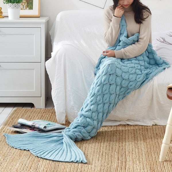 8 Cozy Knitted Mermaid Tail Blankets – Soft Yarn Lap Throw for Adults & Kids, Fantasy Gift with Realistic Fin Design, 2 Sizes