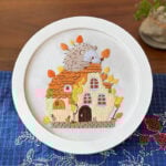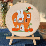 The third embroidery design is full of charm and delight. A white bunny peeks out from the balcony of a pumpkin-shaped house, surrounded by scattered pumpkins and glowing colors. This Animal DIY Embroidery Kit combines bright orange tones with the softness of the rabbit’s figure, creating a cheerful and heartwarming picture. Every stitch adds life to the playful details, from the curved pumpkin windows to the tiny accents of greenery. It is the perfect design for those who love cheerful, fairy-tale-inspired home décor.