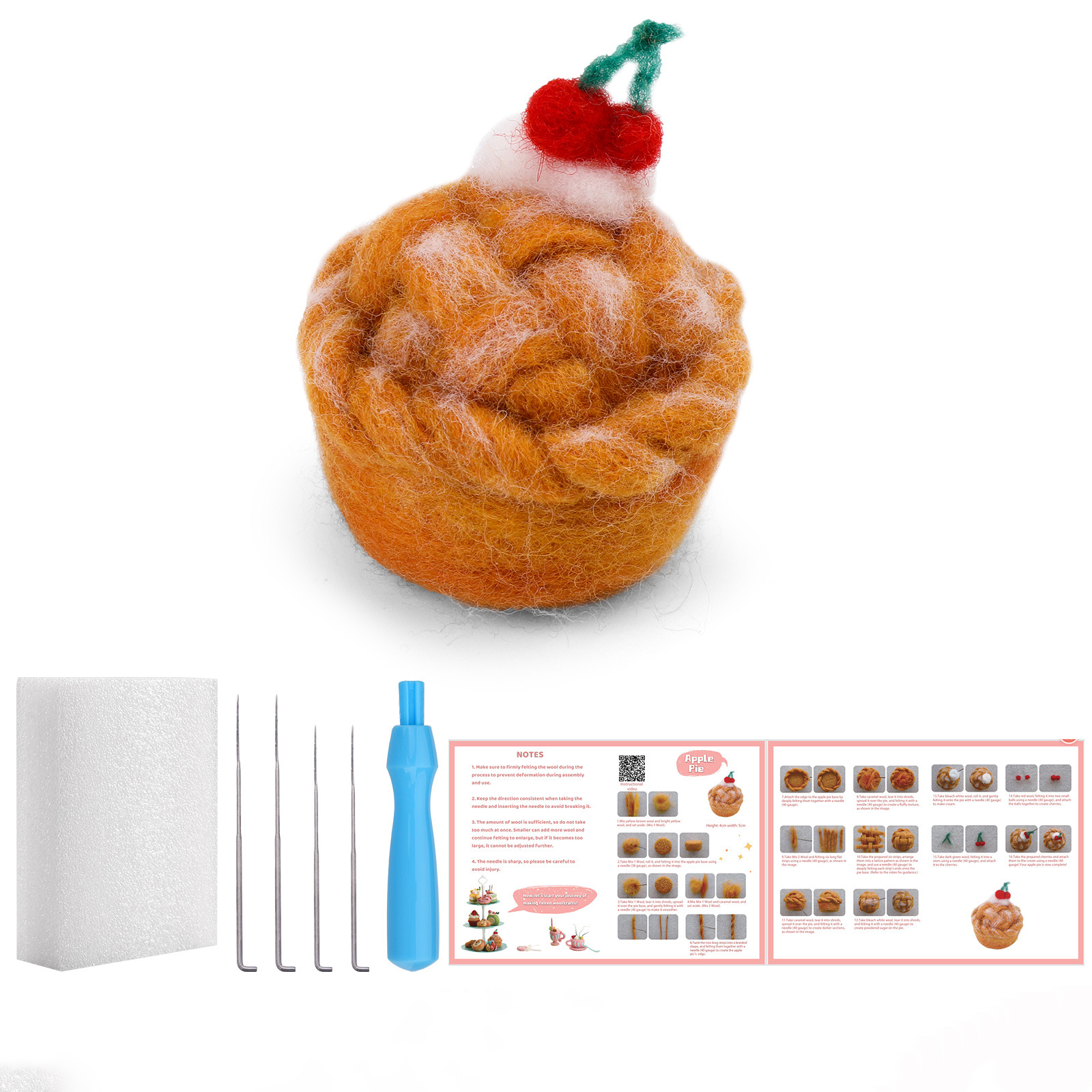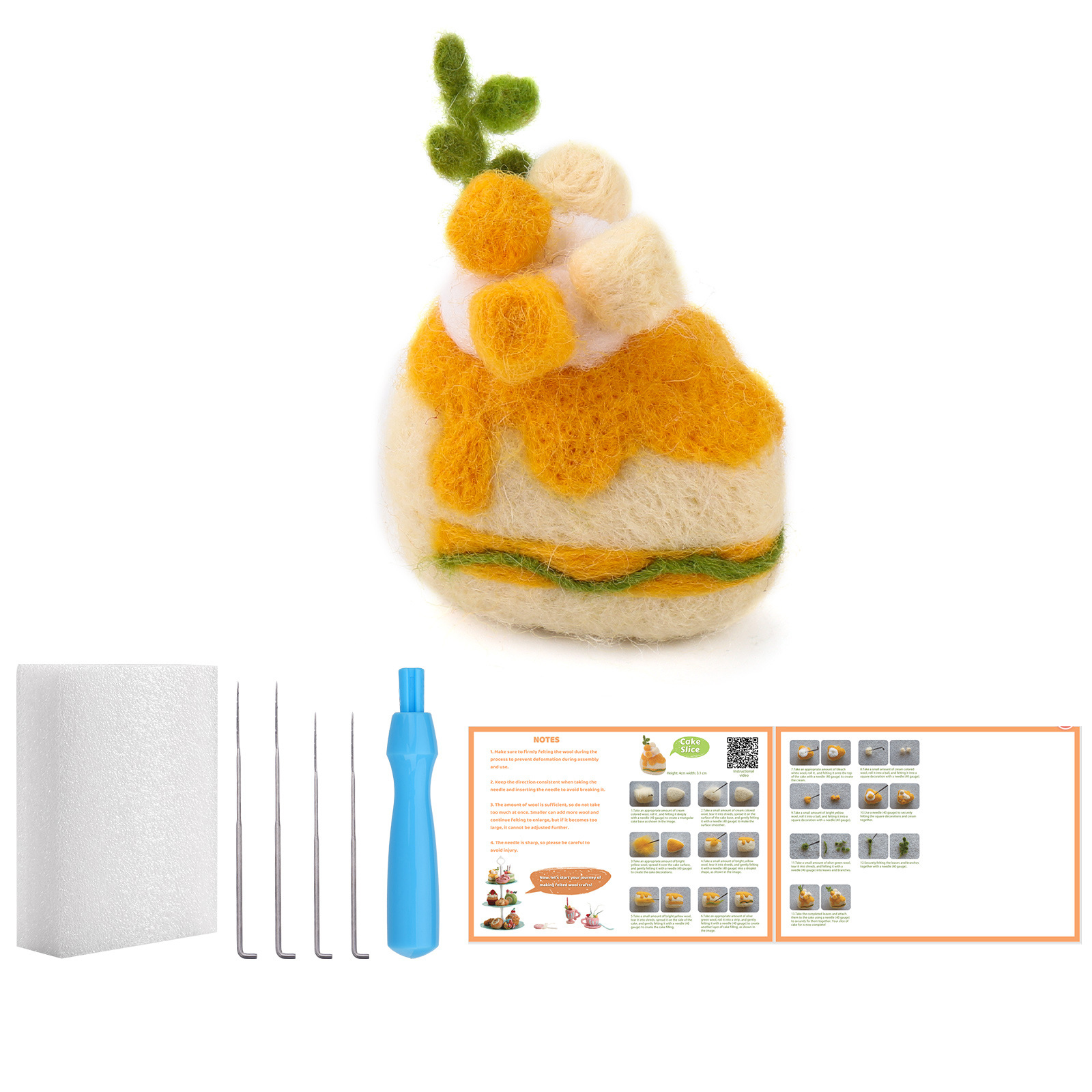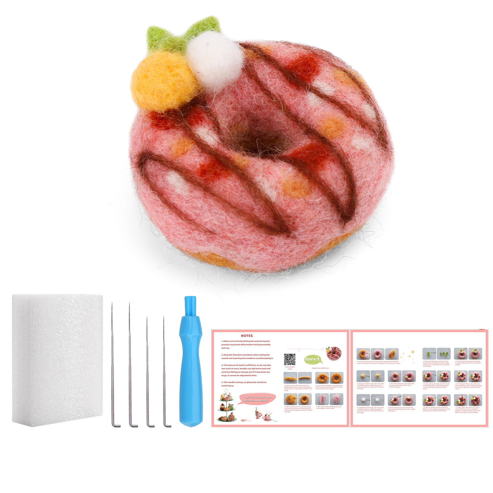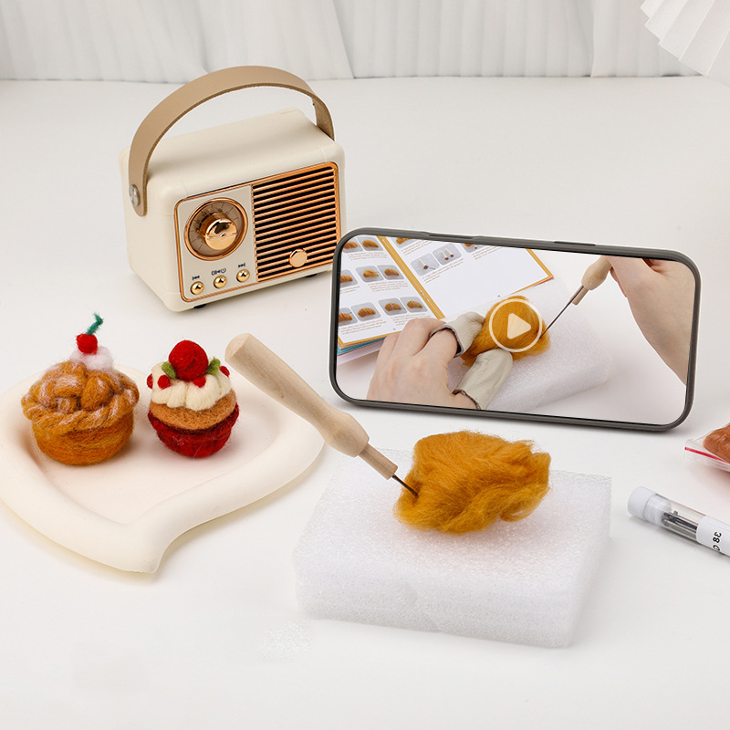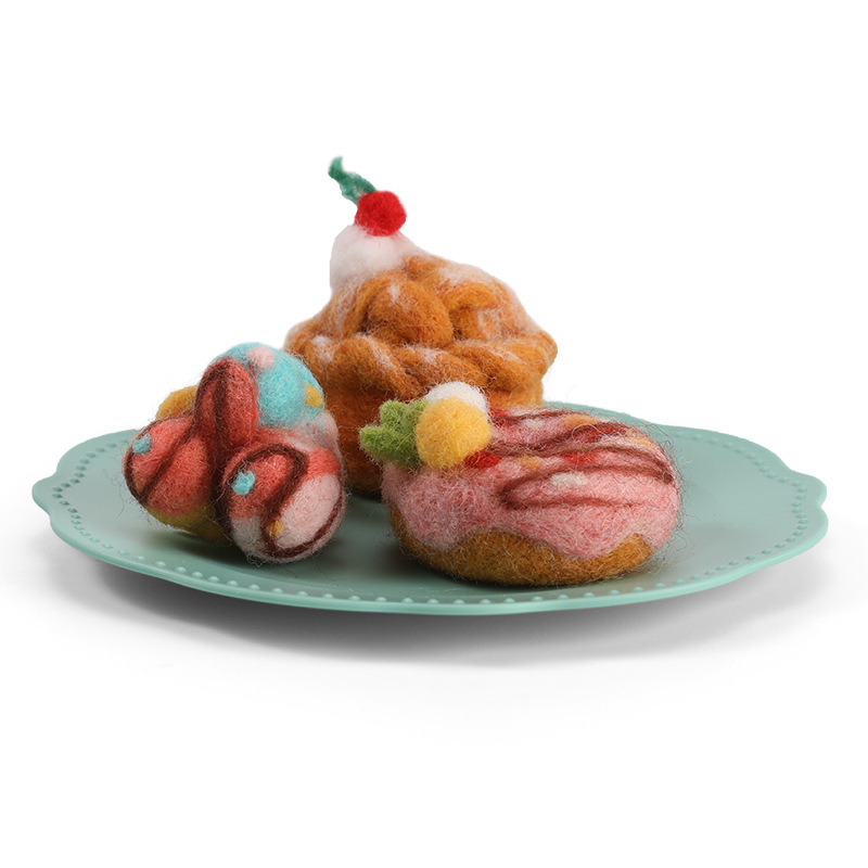 This wool felt dessert kit comes with everything you need to start felting immediately: colorful soft wool, durable felting needles, a foam mat, and an easy-to-follow illustrated tutorial. Each tool and color has been carefully chosen to make the process both simple and satisfying.