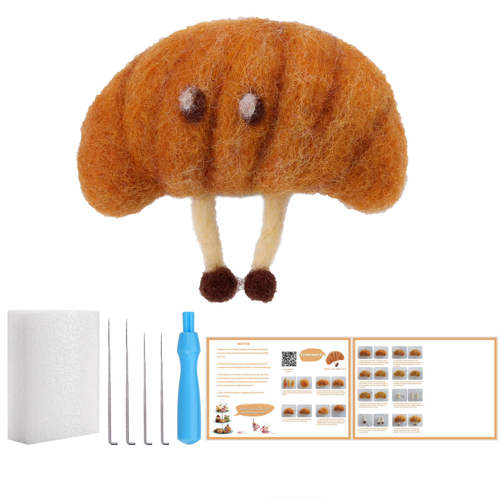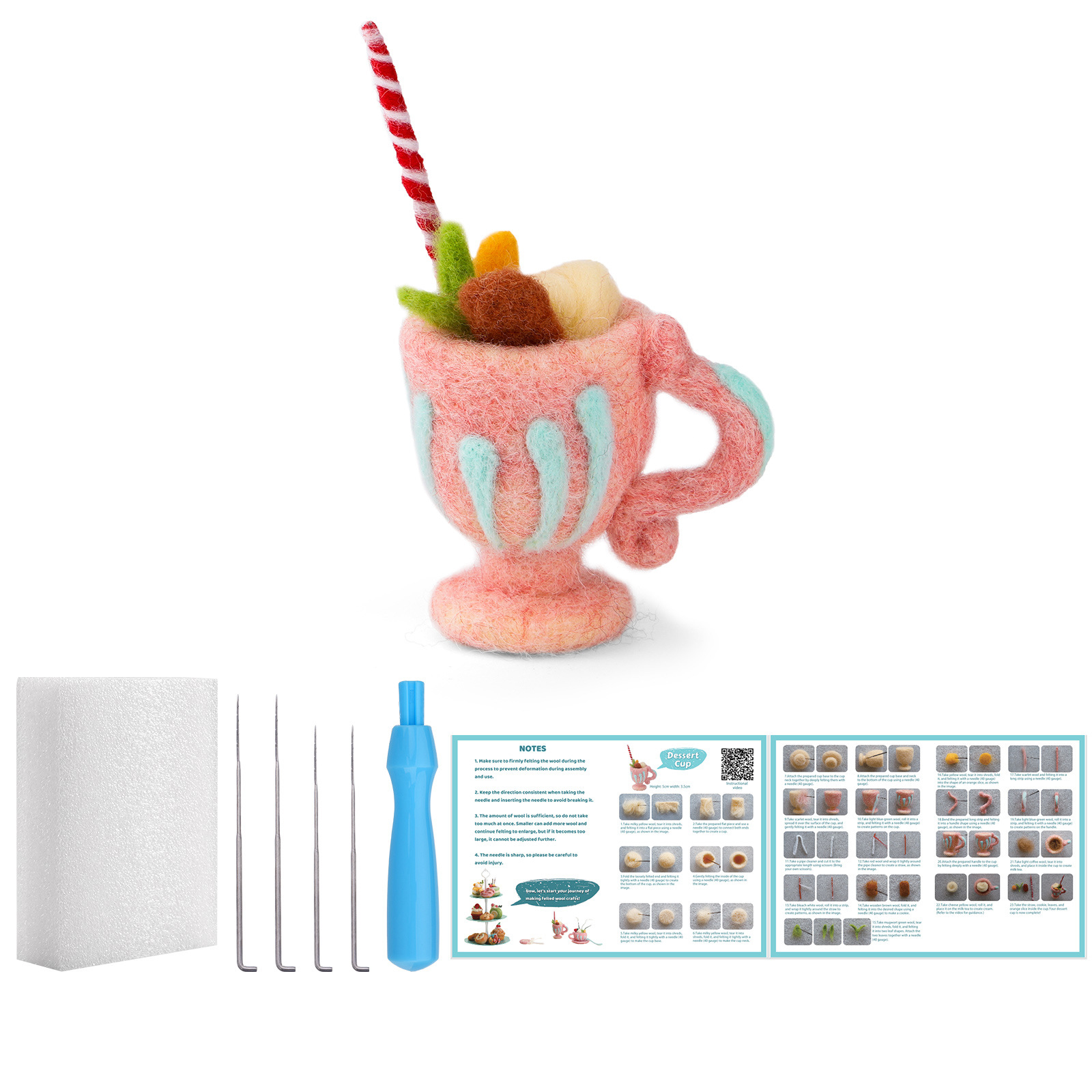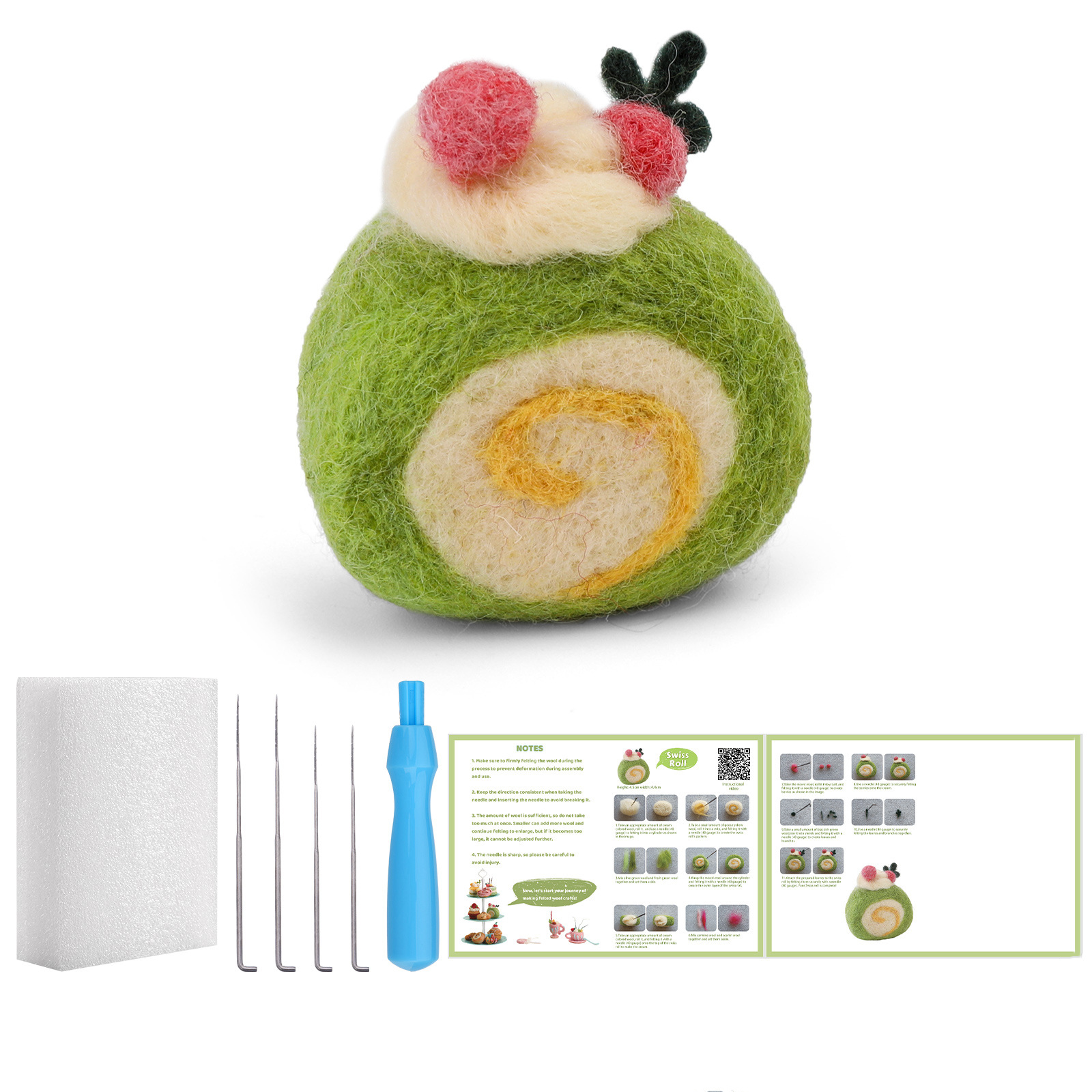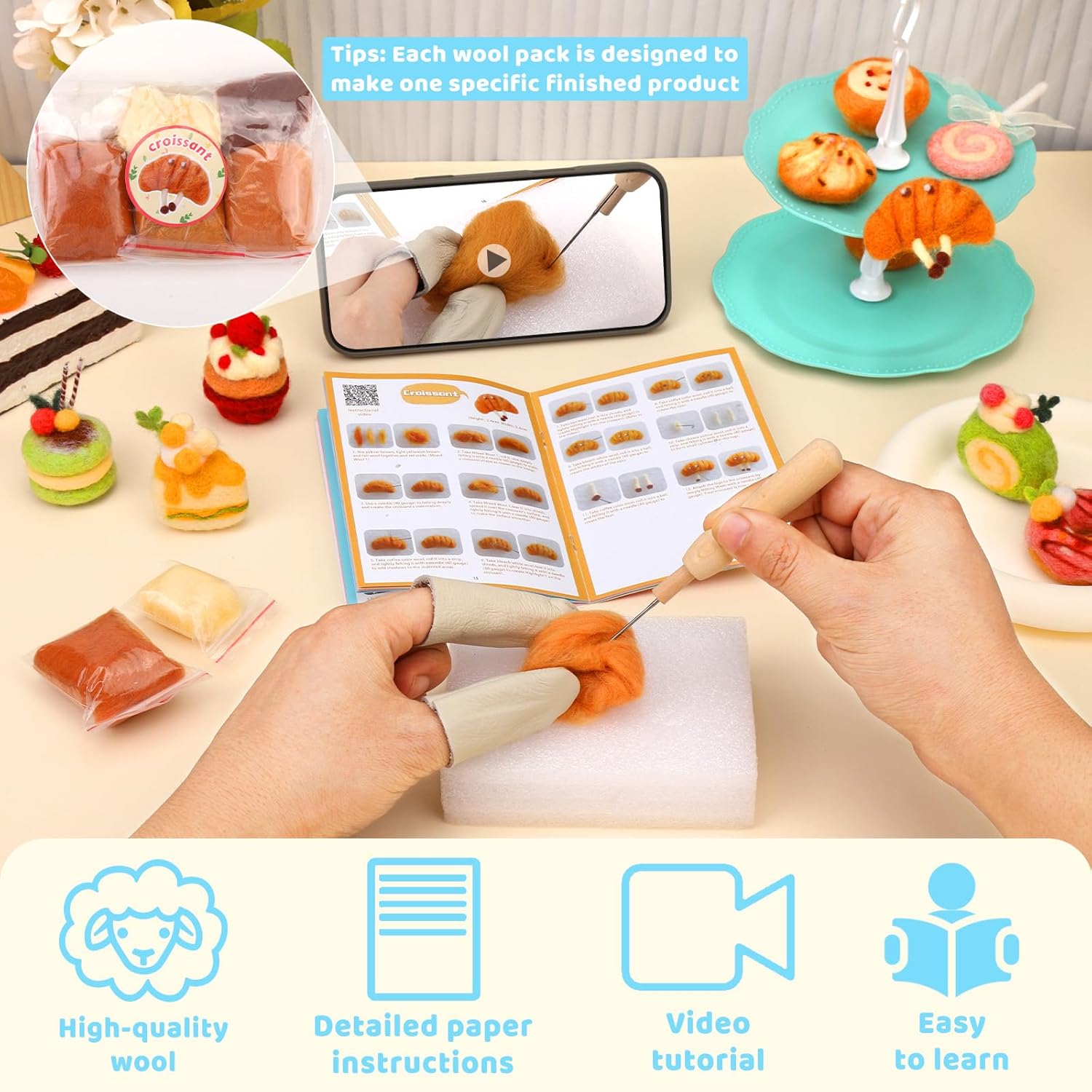 This wool felt dessert kit comes with everything you need to start felting immediately: colorful soft wool, durable felting needles, a foam mat, and an easy-to-follow illustrated tutorial. Each tool and color has been carefully chosen to make the process both simple and satisfying.