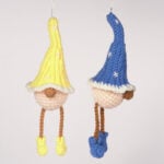 Each crochet gnome kit is made in the traditional Scandinavian gnome style: a faceless figure with a big round nose, a tall, curved pointed hat trimmed in white fluff, and tiny dangling legs with pointy shoes.