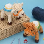 Each finished camel stands in a proud yet gentle pose, featuring carefully crafted humps decorated with layered crochet “saddle blankets.” The beige version showcases cheerful blue and yellow waves, while the brown camel features soft greens and yellows inspired by desert oases. Both have fluffy fringe-like manes, bright orange reins, and tiny hooves in dark brown for a touch of contrast. The result is a handmade plush that feels both playful and artful—an ideal project for animal lovers.