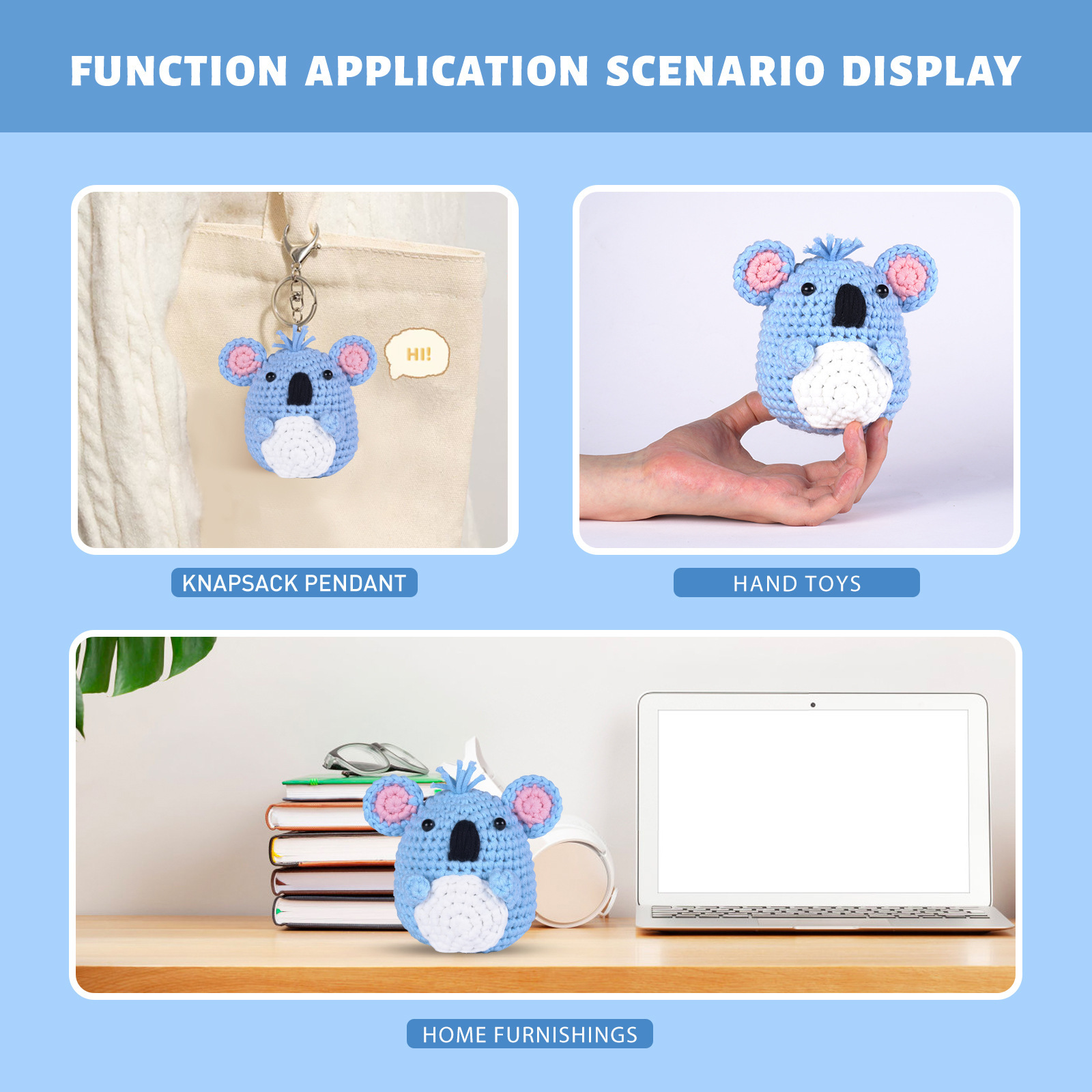 Everything you need to make your own crochet koala kit is thoughtfully included: Soft acrylic yarn in pale blue, white, pink, and black Yarn needle for sewing parts together Stitch marker (optional) Step-by-step crochet pattern (PDF or printed, depending on your selection) Please note: This is a DIY crochet koala kit. The finished plush shown in the photos is for reference only.