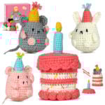 DIY Crochet Birthday Party Animal Kit – Make Cute Bunny Mouse Pig and Layered Cake with Candle Lid for Gift or Decoration