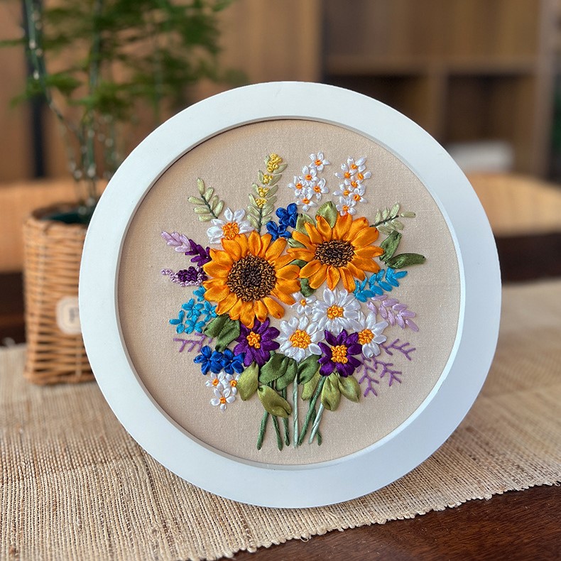 Ribbon embroidery is known for its three-dimensional quality, and these kits highlight that uniqueness in every flower. The daisies appear plump and bright, the lavender stems sway with quiet elegance, and the sunflowers radiate warmth. By following the guided stitches, you will see simple ribbons transform into petals and leaves that look astonishingly real. This artistry gives each finished piece a sculptural quality that is perfect for hanging on the wall, offering both beauty and texture that ordinary prints cannot match.