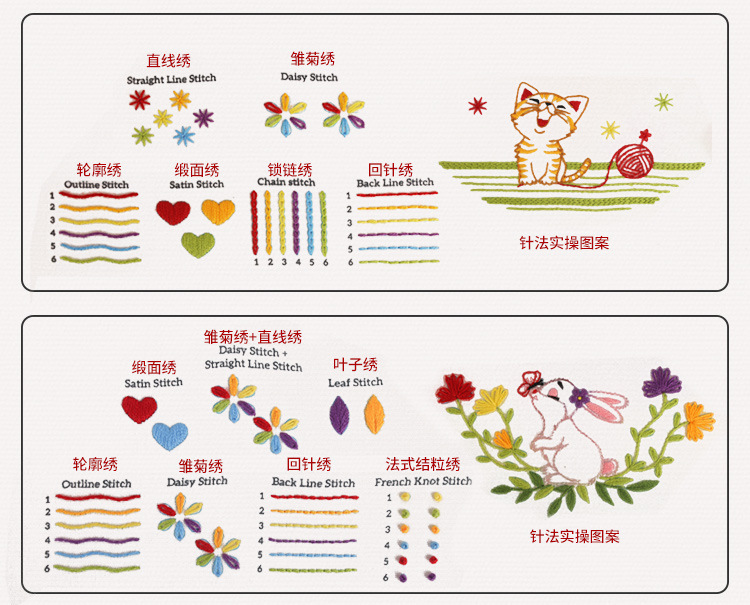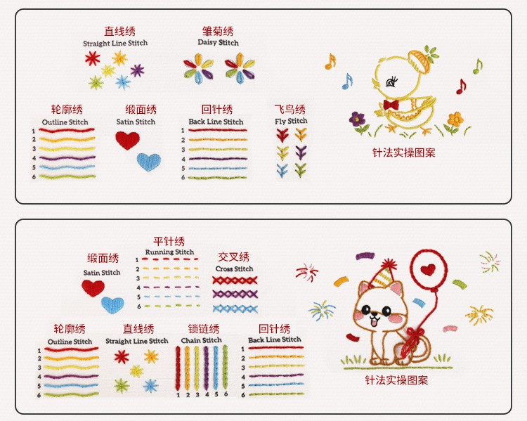 One of the joys of these embroidery practice kits for beginners is the way they incorporate playful animals into learning. Imagine stitching a bright yellow chick wearing a little red bow, surrounded by flowers and musical notes, while practicing straight lines and fly stitches. Or bring to life a curious orange kitten fascinated by a ball of yarn as you try out chain stitch and outline stitch. There is also a festive birthday party cat, complete with balloons and confetti, offering the chance to explore cross stitch and running stitch. Each design feels like a small story that makes embroidery approachable and fun.