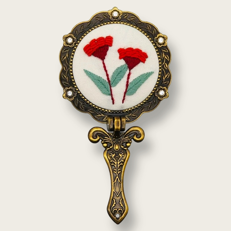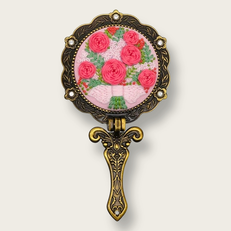 This kit balances old-world charm with contemporary design. The brass frame and rhinestone accents evoke nostalgia, while the vibrant floral embroidery and compact folding style make it relevant for today’s lifestyle. Each mirror not only reflects your appearance but also your creativity, patience, and dedication.