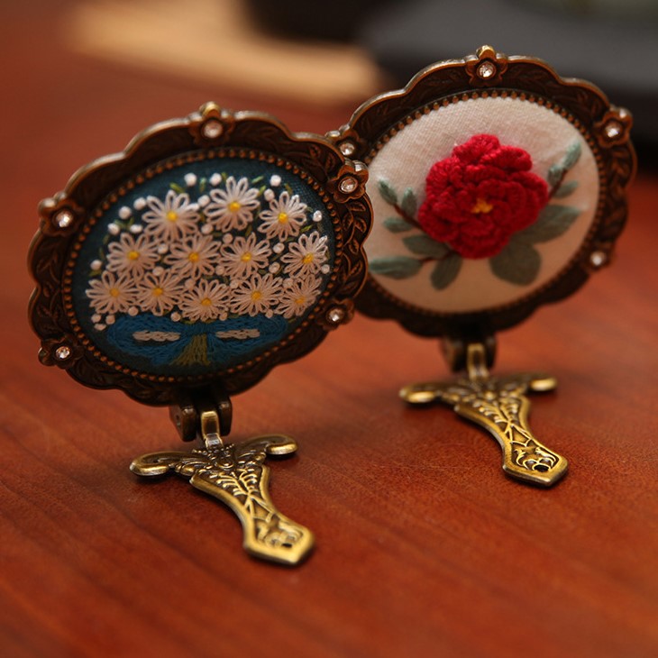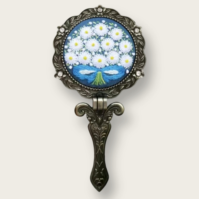 Discover the joy of creating your own hand embroidery makeup mirror kit, a perfect blend of vintage charm and modern practicality. Each kit allows you to craft a folding cosmetic mirror adorned with intricate floral embroidery, set in a retro brass frame with sparkling rhinestones. Designed for both beginners and seasoned crafters, this kit transforms a simple mirror into a beautiful, personalized accessory that is as functional as it is decorative.