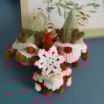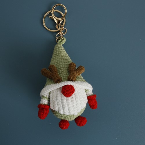 What makes this crochet Christmas gnome keychain set truly special is the individuality of each design. The first gnome comes with a pale green hat decorated with tiny brown antlers, a red nose, and matching red mittens and boots. Its cheerful personality reminds us of playful reindeer and the joy of holiday games.