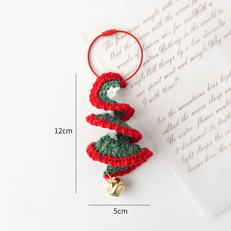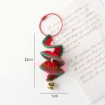 Next is the spiraled green Christmas tree bell, a unique ornament that captures the playful spirit of the season. Its swirling, candy-cane-inspired design adds a three-dimensional effect, making it stand out beautifully among other tree decorations. Crafted layer by layer with vibrant green yarn, its edges feature a bright red accent, adding a festive pop of color. The golden bell at the bottom jingles softly with movement, enhancing the holiday ambiance. Measuring approximately 12cm in height and 5cm in width, this ornament is one of the taller pieces in the set, perfect for drawing the eye on any tree branch.