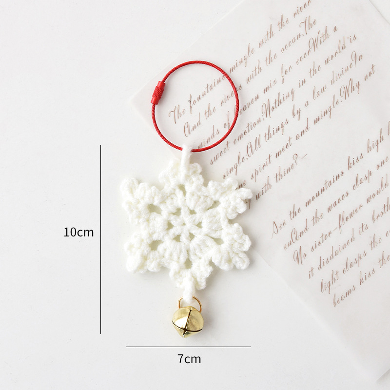 The first ornament in this collection is a delicately crafted snowflake bell, featuring a classic six-point design that embodies the pure beauty of winter. Made with precise crochet techniques, the snowflake shows intricate patterns and texture, evoking a sense of holiday nostalgia. Its pristine white color is complemented by a golden bell at the base and a vibrant red hanging loop, creating a cheerful contrast that shines on your tree. Standing approximately 10cm tall and 7cm wide, this snowflake bell is ideal for adding a subtle yet festive accent to any corner of your home.