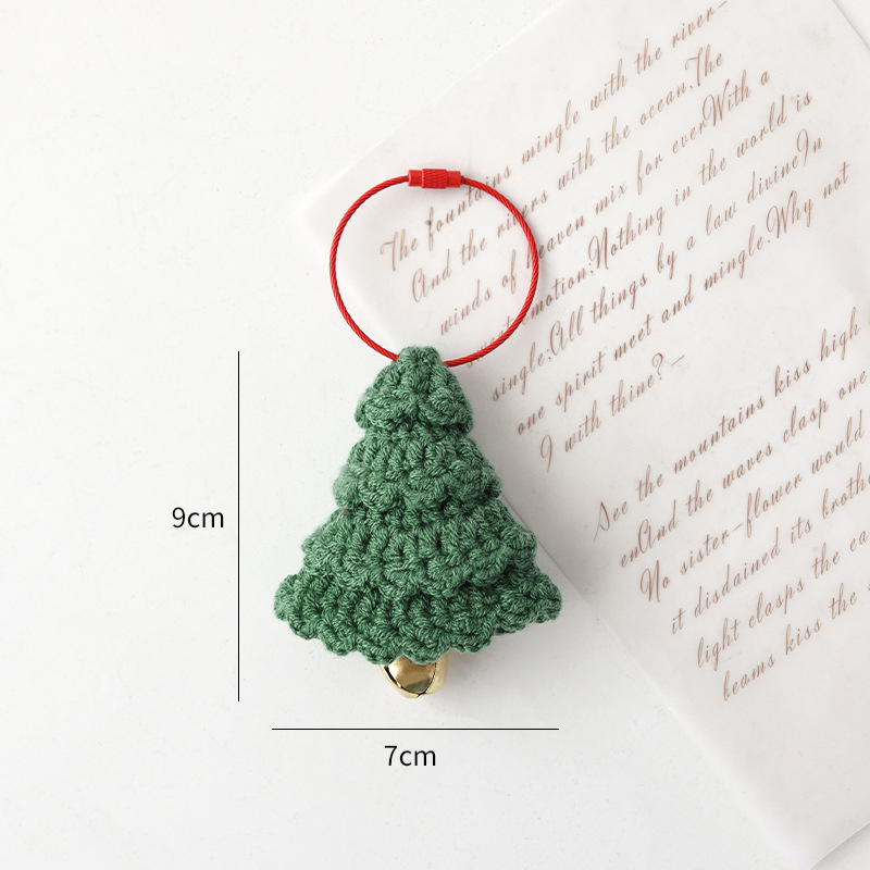 Finally, the set includes a traditional triangular green Christmas tree bell, representing the classic shape of a miniature Christmas tree. Its dense stitching ensures a sturdy, plush feel, while the smooth triangular contours give it a polished, three-dimensional look. The dark green yarn conveys a sense of elegance and sophistication, making it versatile enough for a variety of holiday themes. A golden bell at the bottom adds subtle movement and cheerful sound, and the red hanging loop completes the ornament with a festive flourish. Standing around 9cm tall and 7cm wide, this piece brings both balance and tradition to your holiday display.