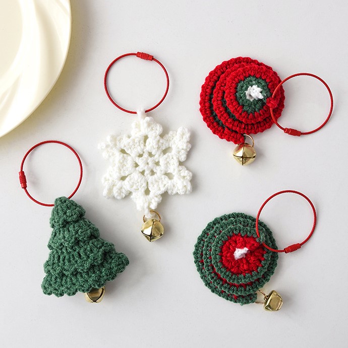These four hand-knitted Christmas ornaments are perfect for multiple uses. Hang them on your tree, attach them to a wreath, or display them on door handles to create a consistent festive theme throughout your home. Their compact sizes make them suitable for small spaces, while their detailed craftsmanship ensures they remain eye-catching focal points. The combination of warm yarn textures, festive colors, and cheerful golden bells adds both visual and tactile pleasure, creating a heartwarming holiday atmosphere.