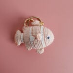 Every stripe is carefully stitched, with vibrant yarn in classic orange, blush pink, or soft blue. The bold contrast of black outlines on fins and tails gives them a striking, animated look. Clip one to your tote or backpack and let it dangle like a tiny ocean friend following you through your day.