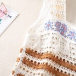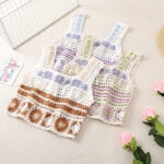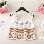 For those who prefer understated elegance, the coffee-colored design brings a more refined and artistic feel. Using warm beige and creamy white yarns, the patchwork feels calmer and more grounded compared to the green version. The granny squares follow the same circular-and-diamond structure, but the muted palette gives it a sense of vintage sophistication. Wide coffee-colored straps and scalloped edges frame the vest, while the embroidered floral accent at the chest ties the piece together with subtle charm. This handmade crochet granny square tank top is ideal for lovers of low-saturation tones who want to wear something relaxed yet chic.