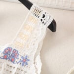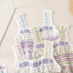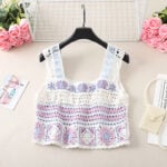 The third design celebrates individuality with its vibrant blue and lilac hues, accented by white. Its granny square patchwork plays with contrast and balance, featuring blue floral centers framed by white diamonds. Unlike the others, this top takes a bolder approach with multi-colored straps that echo the patchwork body, amplifying its playful character. Scalloped trims add texture to the hemline, while the embroidered blue flower with a pink center brings focus to the neckline. This version of the handmade crochet granny square tank top is for those who love to stand out with a statement piece that radiates confidence and joy.
