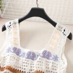 The handmade crochet granny square tank top pays homage to traditional crochet artistry while reimagining it for today’s fashion. Each vest is pieced together from granny square motifs—circles and diamonds that create a nostalgic yet refreshing patchwork pattern. The crochet is light and breathable, making it perfect for summer styling, whether layered over swimwear at the beach or paired with denim shorts for a city stroll. With wide straps and scalloped trims, these tops bring comfort and detail in equal measure.
