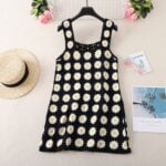 For a more dramatic and vintage-inspired option, the black crochet slip dress offers striking contrast and retro charm. The cream base highlights the deep black floral motifs, with subtle pops of green and yellow at the flower centers, lending a touch of brightness. The result is a timeless combination of monochrome elegance and boho artistry. The wide crochet straps and wave-edged hemline tie the design together, making this handmade crochet slip dress ideal for those who prefer a darker, more sophisticated palette. Perfect for evenings, concerts, or city strolls, it balances boldness with a touch of delicacy.