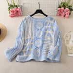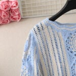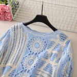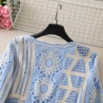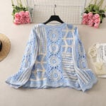 The sky blue version radiates freshness and softness, ideal for those who love airy, calming tones. Its body is crafted from cream-colored floral motifs, delicately accented with diamond shapes and floral patterns in sky blue. This balance of cream and blue creates a gentle harmony that feels light and romantic. Matching blue borders finish the neckline and cuffs, giving the cardigan a cohesive look. This handmade crochet lace knit cardigan brings a graceful, feminine vibe that suits both seaside escapes and everyday styling.