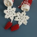 Below the snowman, a beautifully crocheted six-point snowflake dangles gracefully, showcasing intricate stitches and delicate symmetry. The snowy white pattern captures the fragile beauty of real snowflakes while adding a refined, textured element to the design. Suspended from the snowflake is a small red crochet tassel, introducing a touch of movement and color contrast that completes the composition. Together, the snowman, snowflake, and tassel create a layered design that embodies the magic of winter, combining softness, balance, and craftsmanship.