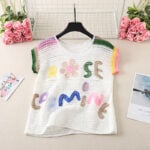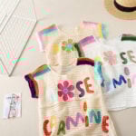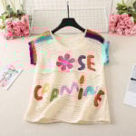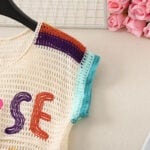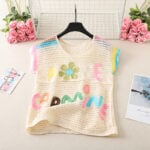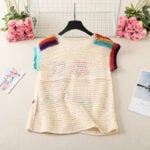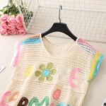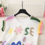 For those who see fashion as art, the multicolor crochet vest is a masterpiece. Using an off-white base as the foundation, it showcases an array of colorful floral motifs in yellow, blue, green, and red. Each flower is unique, with soft pink centers and varied petal shades, giving the vest a painterly quality. Small embroidered leaves add yet another layer of detail, while the neckline and armholes feature a rainbow-like edging that ties the entire design together.