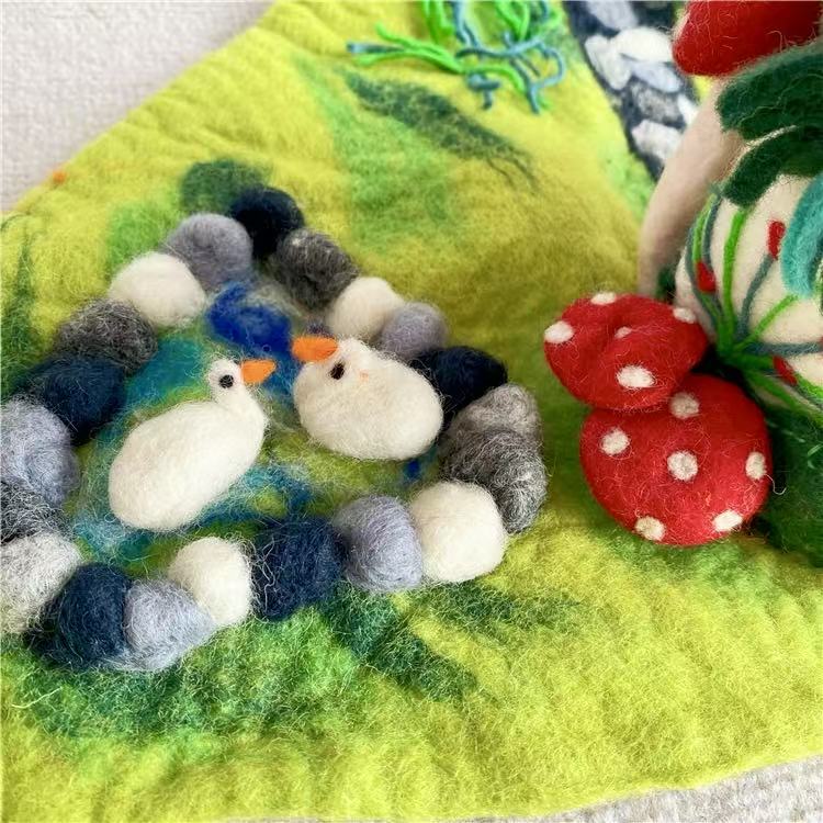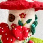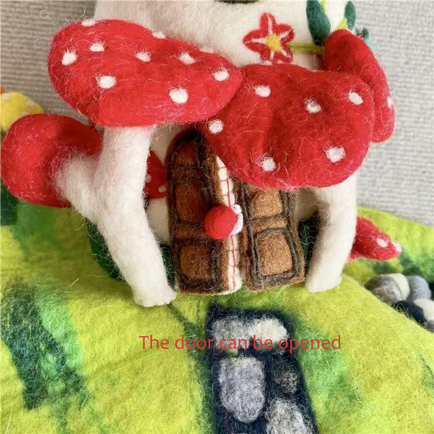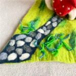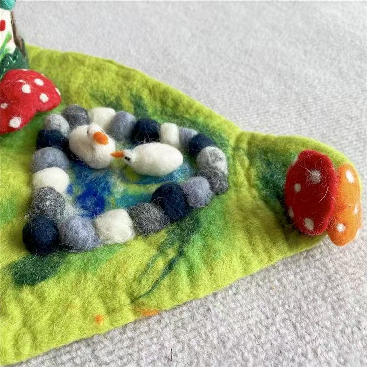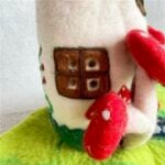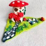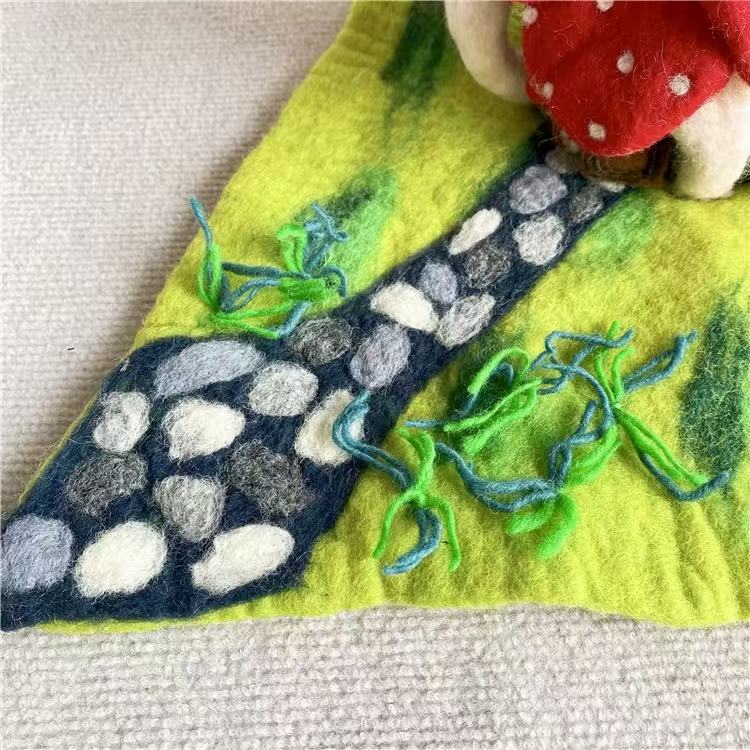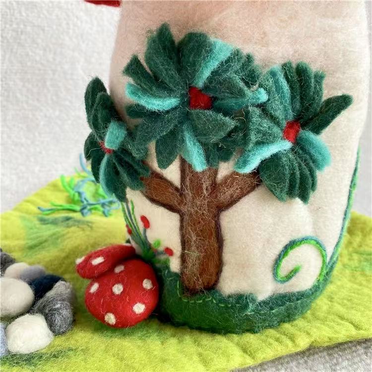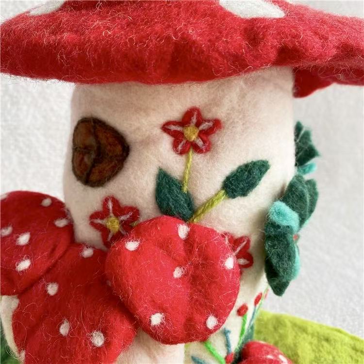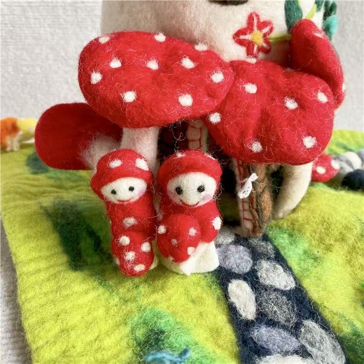 Each mushroom roof is hand-shaped, and every color gradient is blended from wool fibers by hand, giving the piece its organic variation. Nothing here is rushed or machine-perfect. The beauty lies in its slight irregularities — the proof of a human touch, of hours spent creating something meant to last.