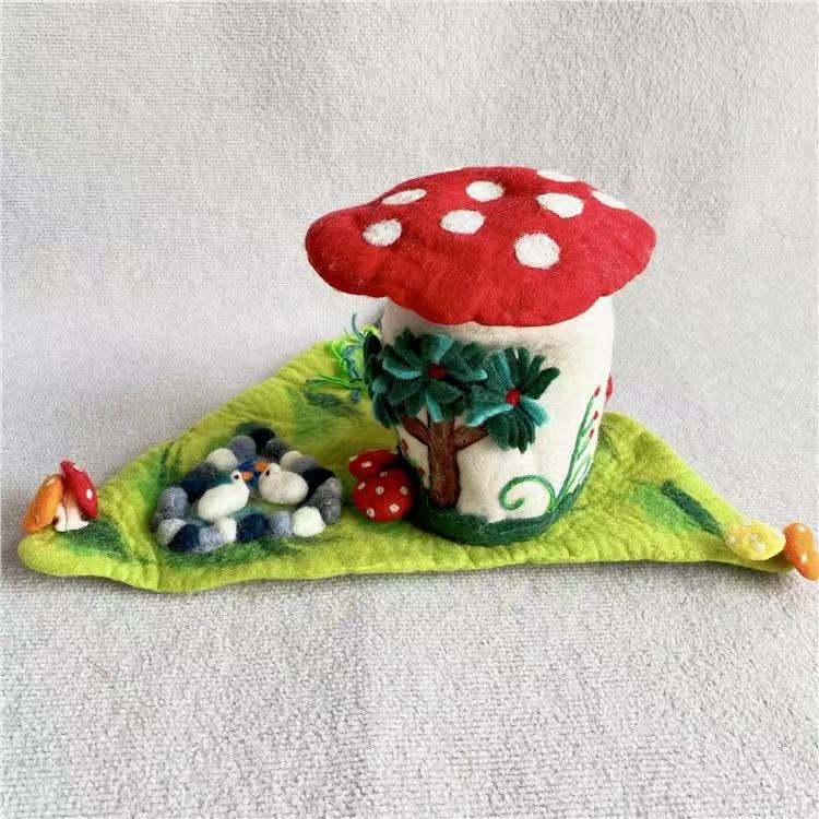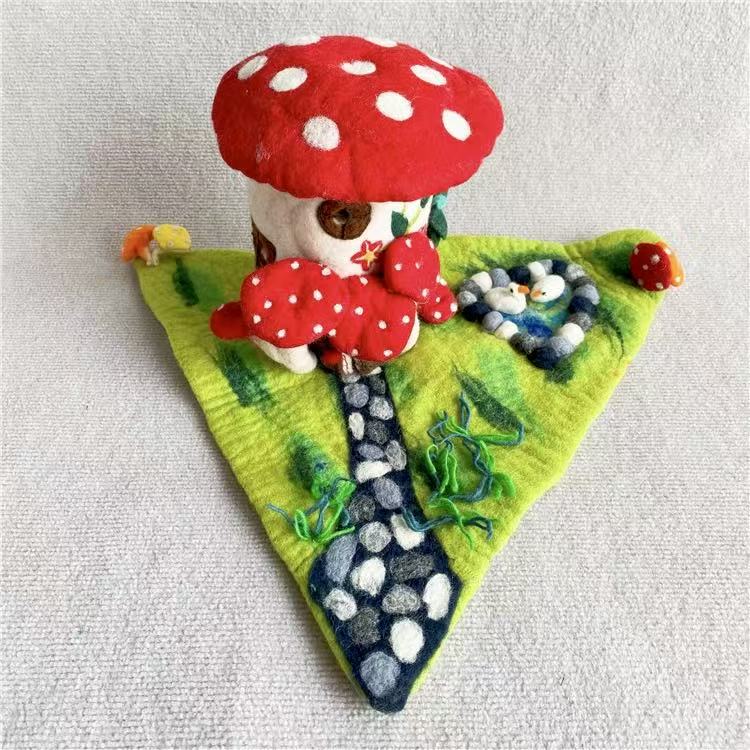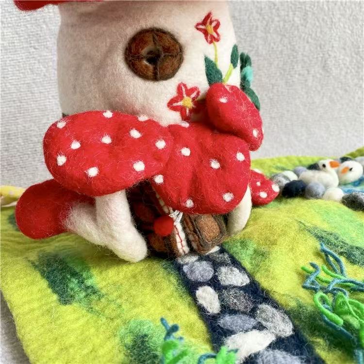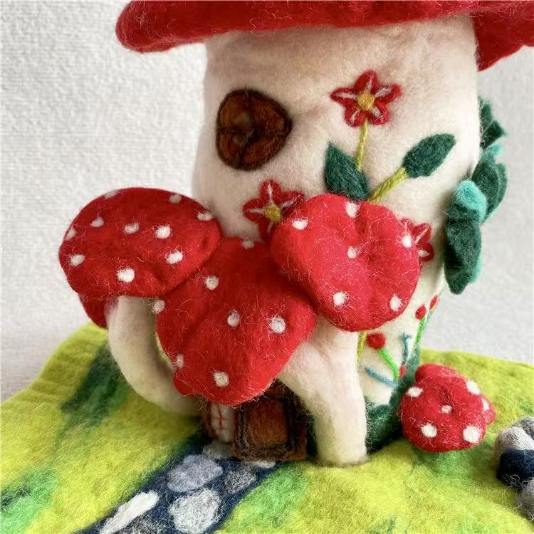 The felt mushroom house diorama serves not only as a decorative accent but as a symbol of patience and creativity. It embodies the idea that even in a fast world, there is room for gentle things — for art made by human hands, one careful stitch at a time.