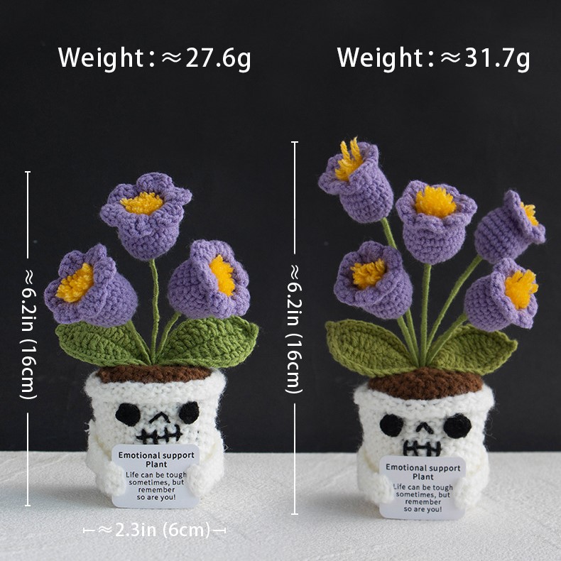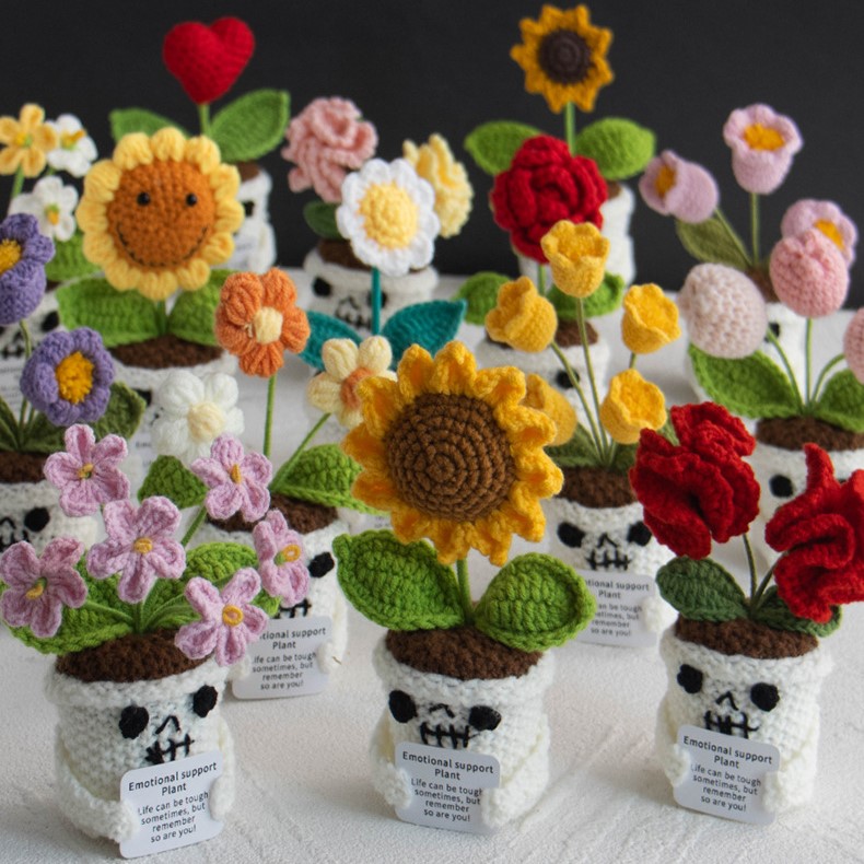 Each crochet emotional support plant doll begins as a simple ball of yarn, transformed through hours of patient craftsmanship. The skull-shaped pot is crocheted with sturdy stitches to maintain its shape while retaining a soft, tactile feel. Above the pot, a variety of colorful crochet flowers bloom — from classic sunflowers and roses to whimsical tulips and heart-shaped blossoms. Every combination is slightly different, ensuring that no two dolls are ever exactly alike.
