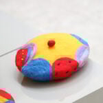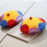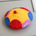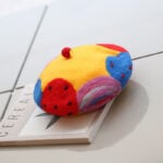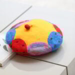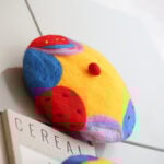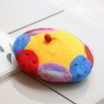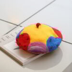 The base color is a rich, sunny yellow that instantly brightens any winter day. Around the edges, you’ll find a playful combination of red, blue, and pink patches, each blending and overlapping in a way that creates a captivating visual rhythm. The bold contrast between the colors adds depth and vibrancy, making this beret a true conversation starter. With its unique patterning, every hat feels like its own miniature work of art.