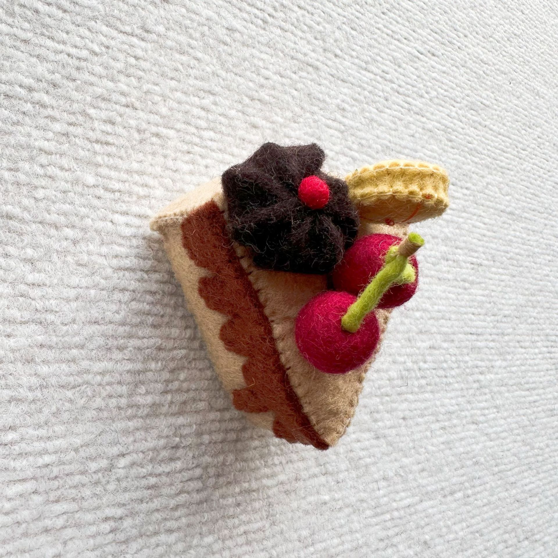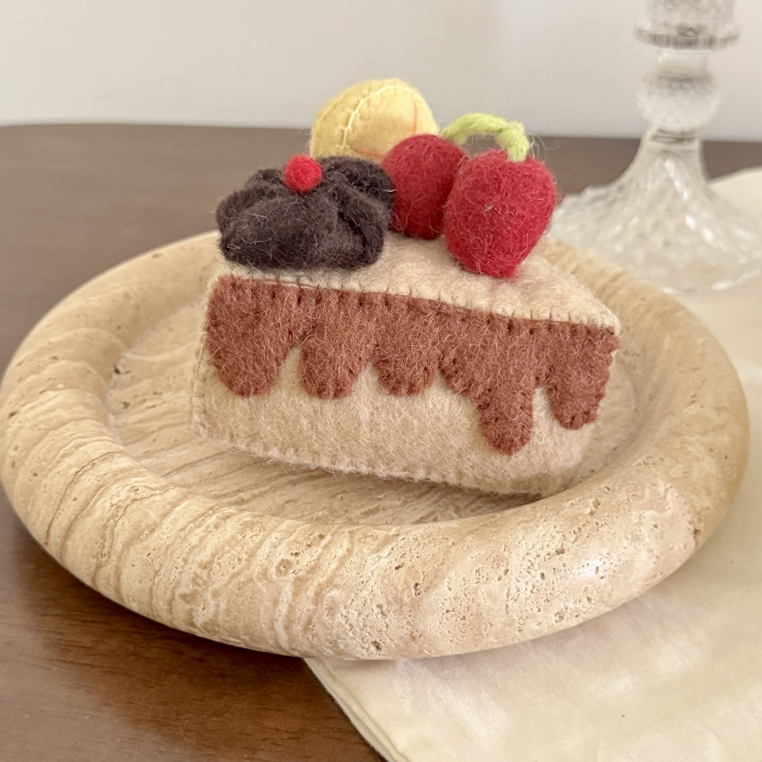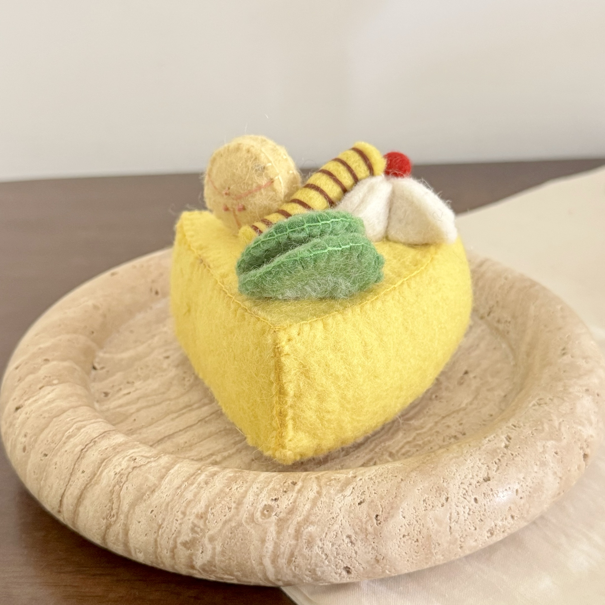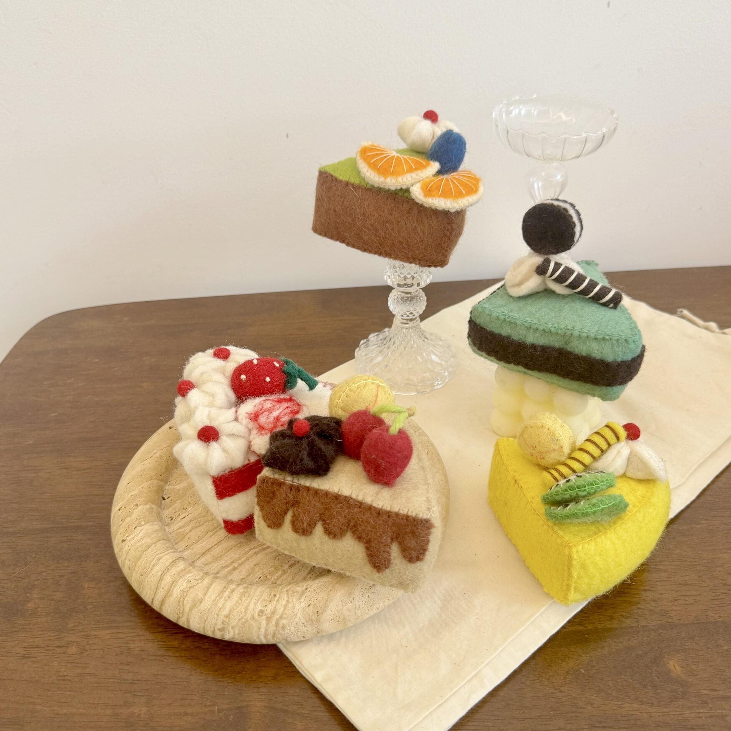 Each felt cake slice is thoughtfully curated with high-quality wool felt sheets, felting needles, and a durable foam base. The texture of natural wool gives every dessert slice a soft, cloud-like appearance, while the layering technique mimics the rich folds of real pastry. As you needle each piece into shape, the wool fibers interlock gently, creating a solid yet fluffy texture that feels both comforting and rewarding to work with.